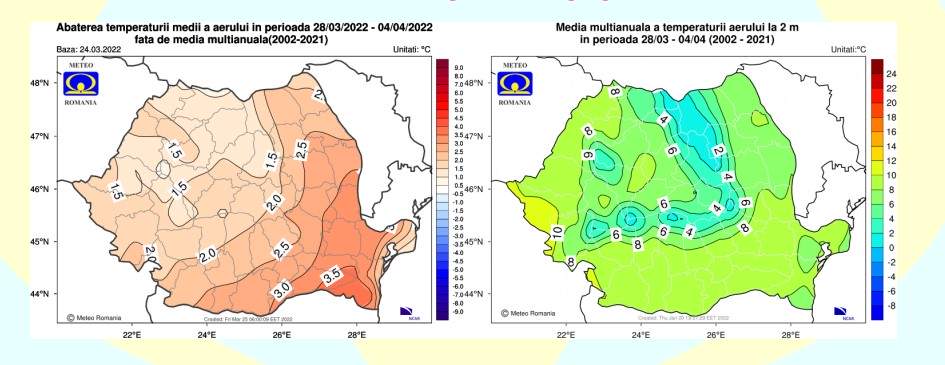 Mediile valorilor termice se vor situa peste cele specifice acestei săptămâni, în cea mai mare parte a țării. Regimul pluviometric va fi excedentar în regiunile vestice și sudvestice, dar mai ales în cele nord-vestice, iar în rest va fi apropiat de cel normal pentru acest interval, potrivit ANM.
