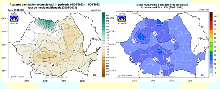 Valorile termice vor fi mai ridicate decât cele specifice pentru această săptămână în regiunile estice și sud-estice, iar în rest vor fi în general apropiate de cele normale pentru acest interval. Regimul pluviometric va fi local excedentar în extremitatea de nord a țării, dar și deficitar în regiunile sudice, estice, centrale, dar mai ales la munte, iar în rest va fi în general apropiat de cel normal pentru această perioadă, potrivit ANM.